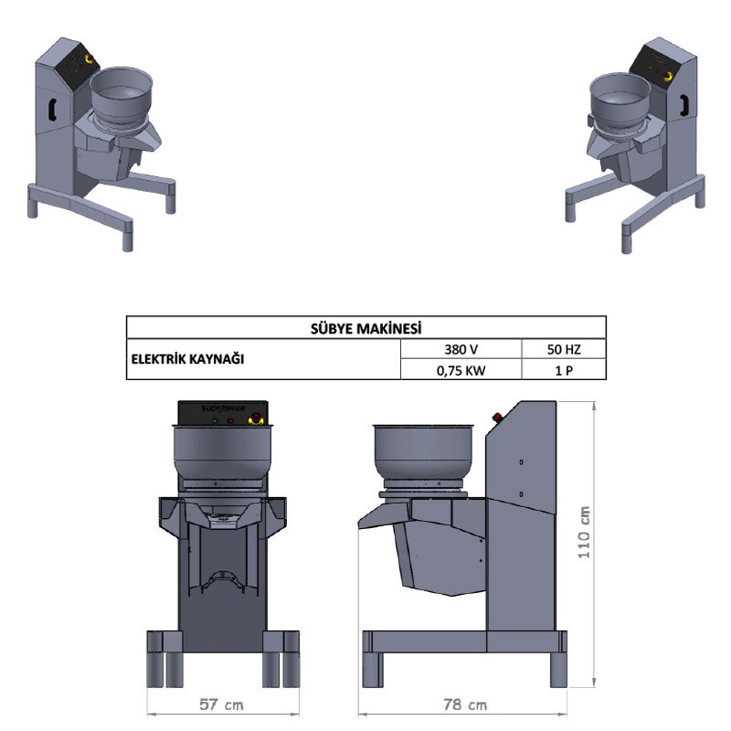 Yüklemeli kazan öğütücü tiptedir. Sürekli mal takviyesi yapılabilir. En az 32 saat topraklanan kırık pirinç kendi suyu ile birlikte çekilir ve krema şeklinde yağımsı, sütlü tatlıların vazgeçilmez bağlayıcısı, sübye elde edilmiş olur. Pirinci öğüten çarklar dahil bütün parçalar paslanmaz çelikten imal edilmiştir. Bu nedenle insan sağlığına hiçbir zararı yoktur. Gönül rahatlığı ile kullanabilirsiniz.