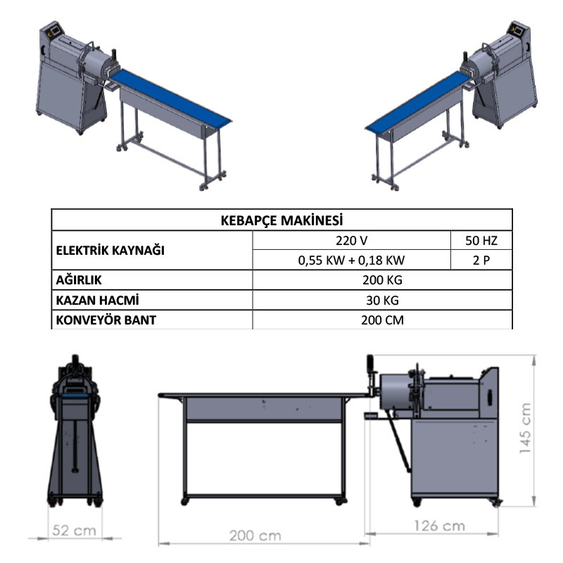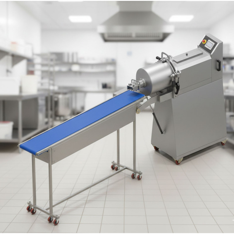 Köfte şekillendirme ve gramajlama makinesine benzer özellikler taşıyan bu makinemizin farklı tarafı ön kesme aparatıdır. Pnömatik piston vasıtası ile kesme bıçağı yukarı ve aşağı yönde hareket ettirilerek köftenin kesme işlemi gerçekleştirilir. Aynı anda birden fazla sayıda kesim yapabilen kalıpları sayesinde çok daha seri bir şekilde hazneyi boşaltabilen makinemizde konveyör bant yardımıyla ürünün toplanması ve paketlenmesi daha seri gerçekleştirilebilir. Konveyör bant, aynı zamanda daha uzun köfte şekillerinin hazırlanmasına da yardımcı olur.